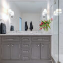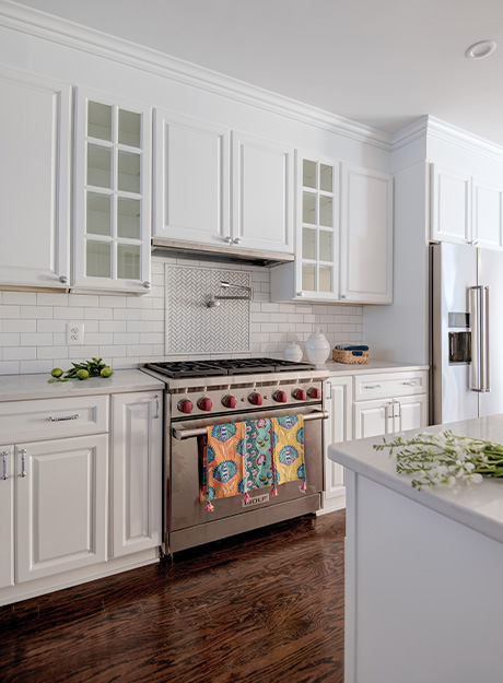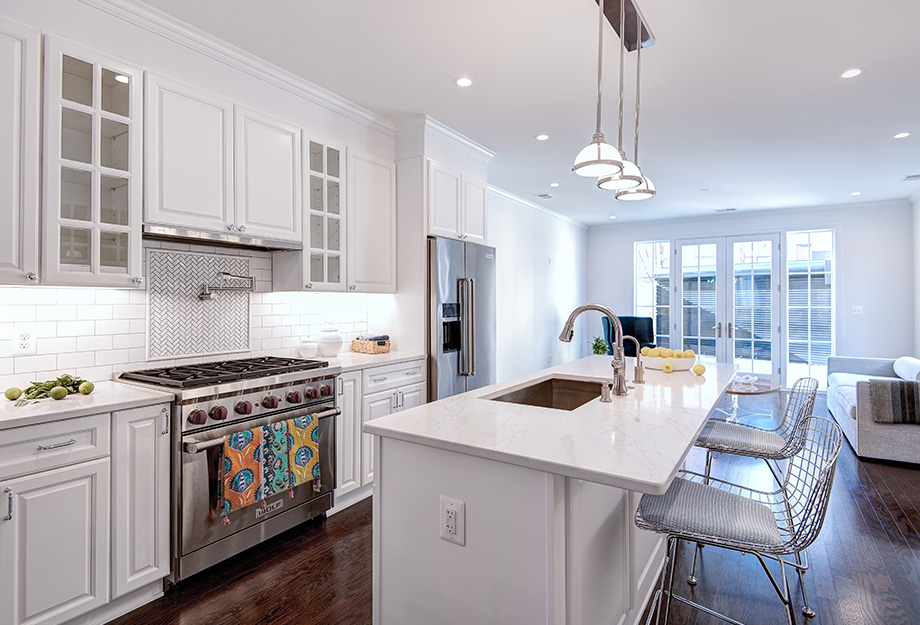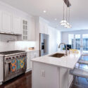 Our team also discovered a cemented over chimney that we turned into a gas fireplace with a newly built mantle, replicating those found in local early 20th century homes. Our carpenters’ craftsmanship makes people think the mantle was original to the house. The third floor addition and extension, and reworked floor plan ensure that the family has the extra space they longed for. The 4 bedrooms, 3.5 baths and numerous (?) walk-in closets meet the day to day needs of a modern family, all while giving nod to the historic nature of the property. You’ll find crown molding, wainscotting, glass doorknobs, a grand staircase. The bank of cabinets, tile choices, high-end appliances and prep sink will guarantee cooks will find this a functional and inspiring kitchen.