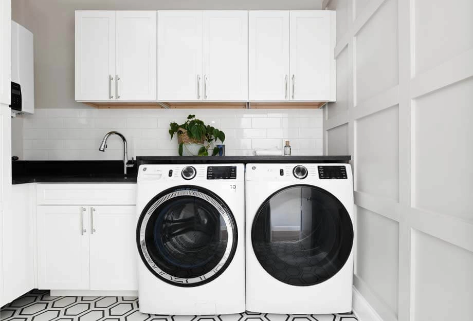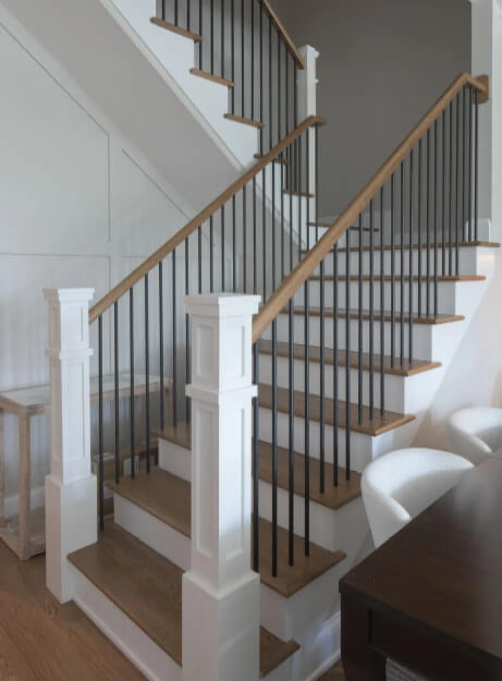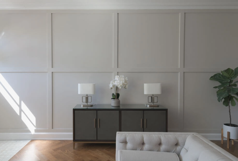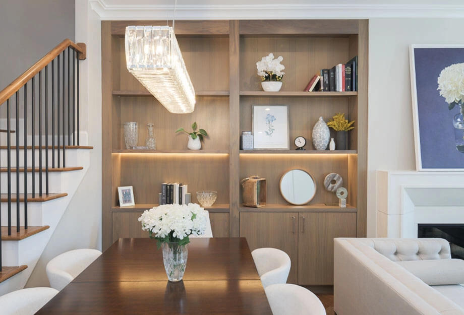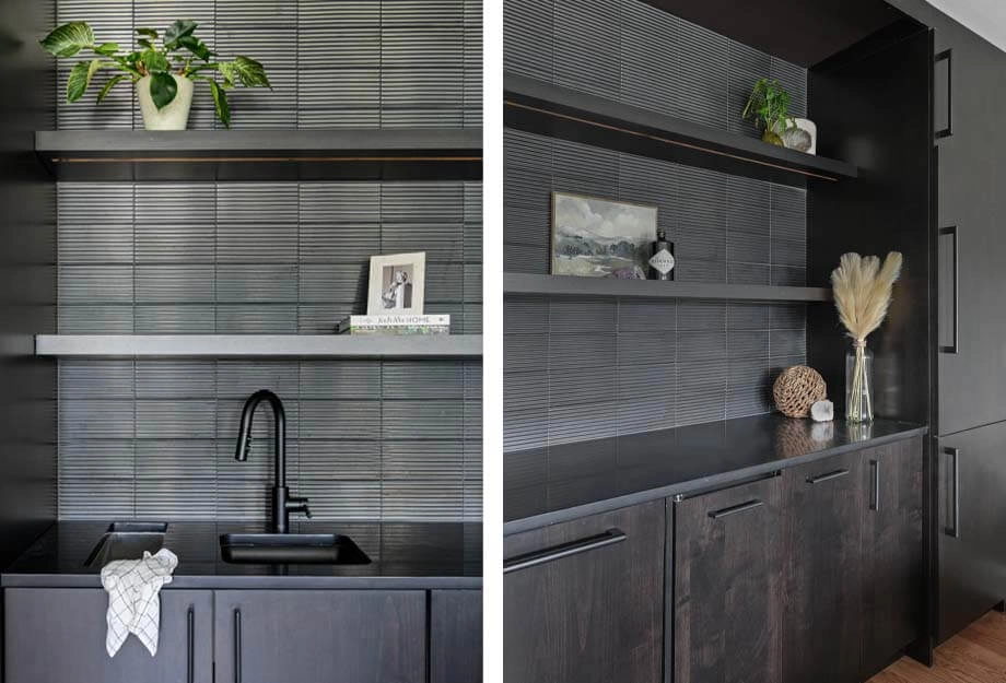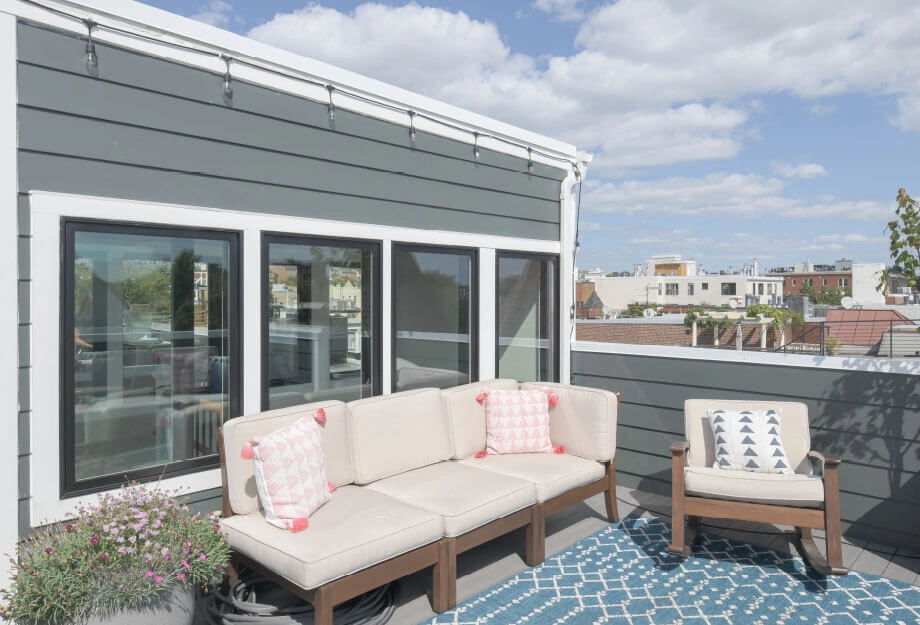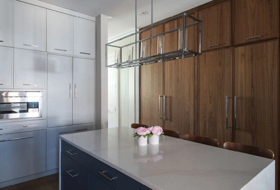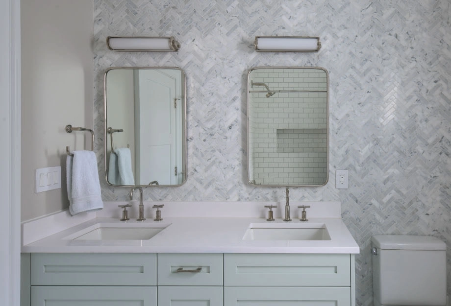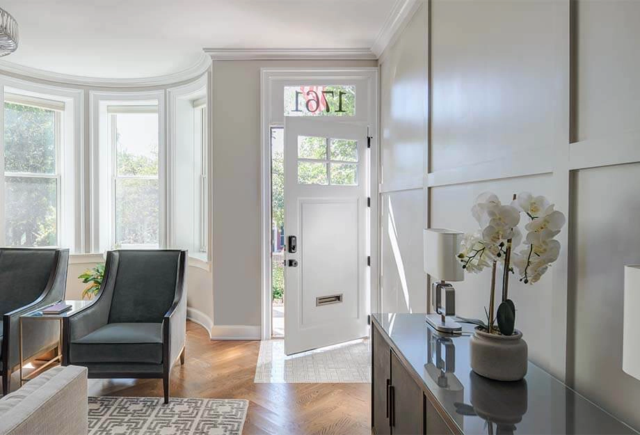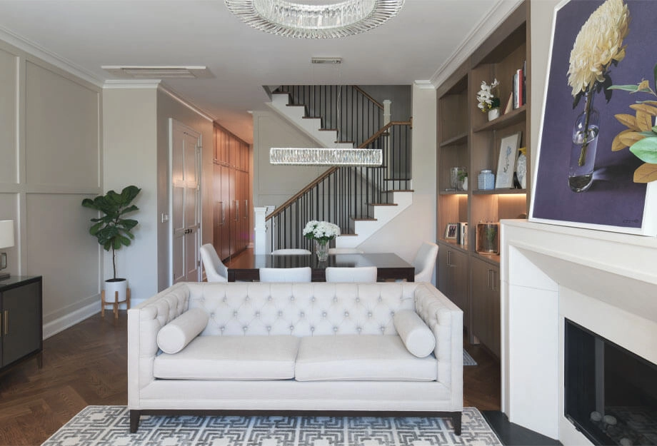 The sophisticated foyer welcomes guests with a custom tile inlay, herringbone wood floors, and meticulously crafted trim, including curved casings and crown molding. Every finish was carefully selected to reflect our client’s refined style while ensuring durability for life with a toddler. The new penthouse access leads to a thoughtfully designed rooftop retreat, offering distinct spaces for relaxation and culinary pursuits.