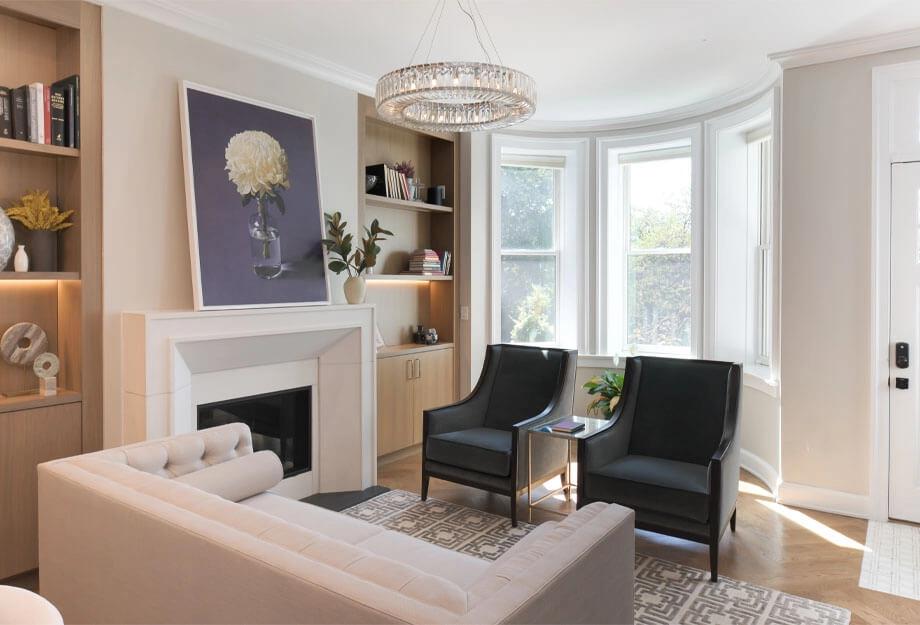 This stunning remodel revitalizes a classic DC row home in Logan Circle, seamlessly blending original charm with modern sophistication and enhanced functionality. By relocating the staircase and kitchen, we optimized flow and created a dedicated family room with elegant built-ins. A rear third-story addition and new roof deck further expanded versatility across all levels, adding an additional floor to the home without sacrificing its historic character.