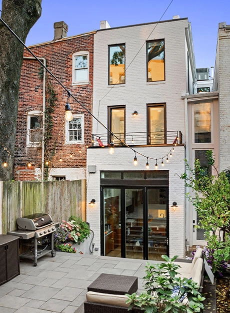 This row home remodel turned an outdated Capitol Hill home into a beautiful, functional space that truly honors its original charm. Designed for a growing family of five, we reimagined the main floor by relocating the kitchen, adding a cozy family room and powder room, and creating a seamless indoor/outdoor flow. A three-panel accordion door opens to a newly designed rear patio, effortlessly connecting the home to the outdoors. Full-width stairs lead from the lower rear entrance to the elevated patio, which now serves as a peaceful gathering spot between the main home and the new carriage house.