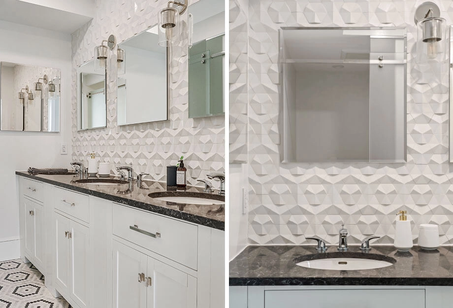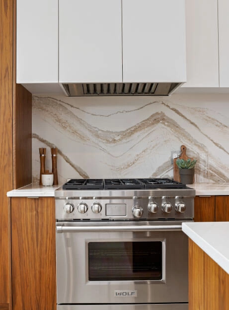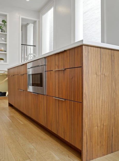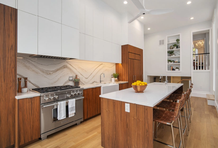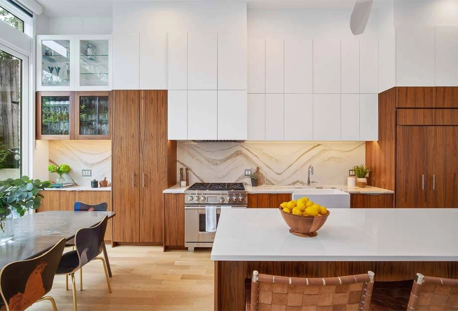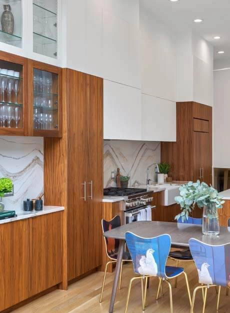 The kitchen, once tucked away in the basement, is now the heart of this full home remodel. We reworked the stairs to improve flow and turned the basement into a warm family room. A glass railing between the kitchen and family room enhances the openness. The third floor was expanded to create three spacious kids’ bedrooms, a built-in library, and a thoughtfully designed bath.